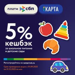 С 1 сентября по 31 декабря 2025 года по мск при оплате услуг детских садов через Систему быстрых платежей (СБП) на ресурсах «Екарта. Школьные сервисы» можно получить кешбэк 5%.